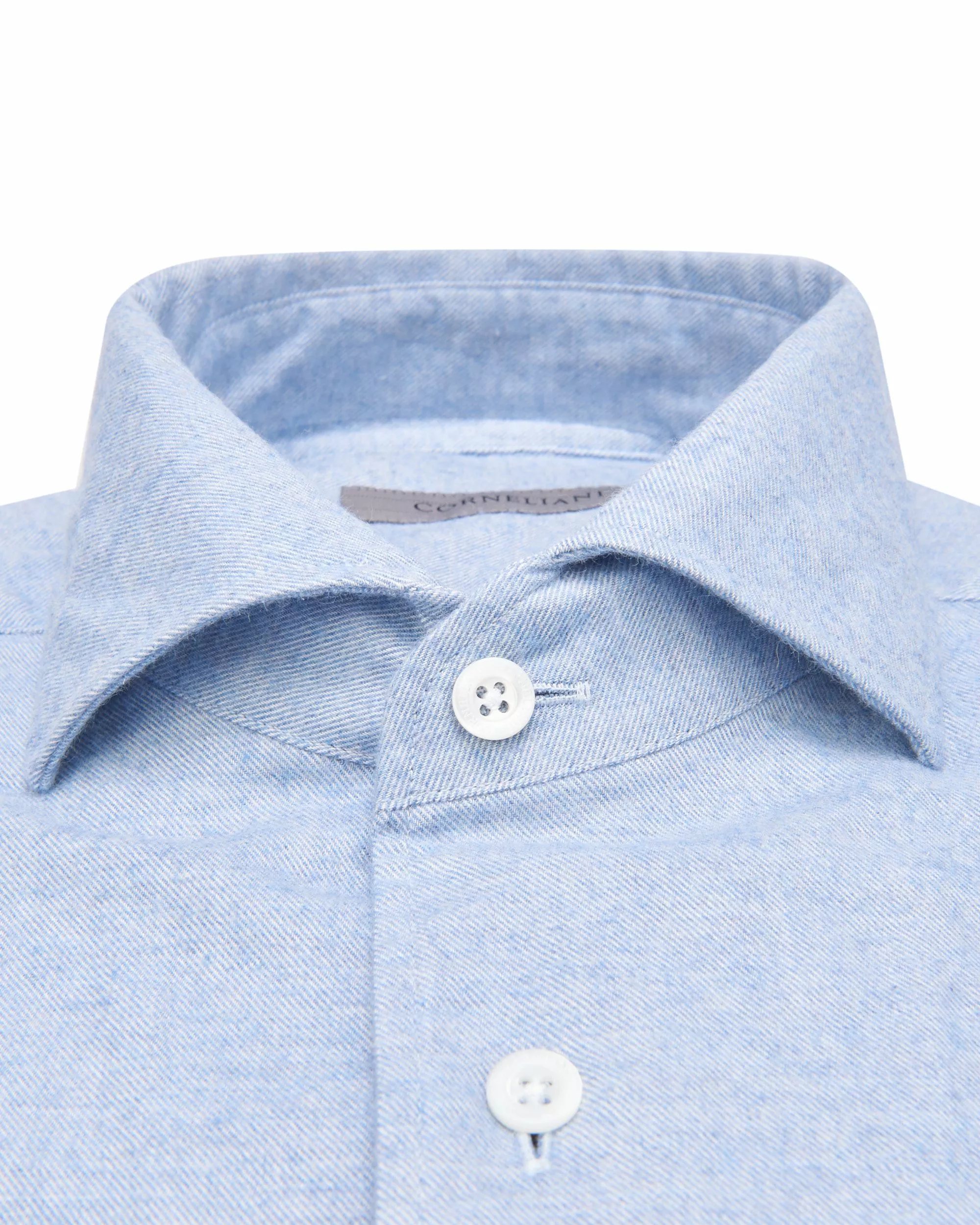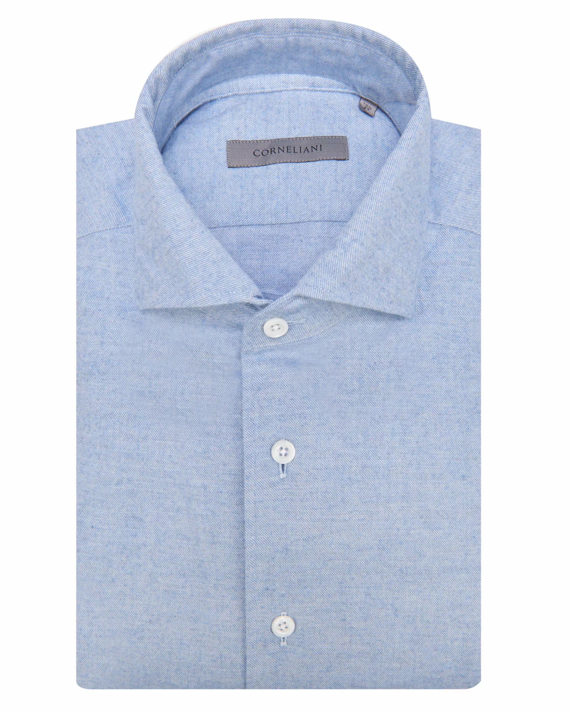 Een business overhemd van het merk Corneliani, gemaakt van 100% geruwd katoen. Het overhemd heeft lange mouwen, sluit met knopen en heeft een cut away boord. Het hemd heeft een eff…