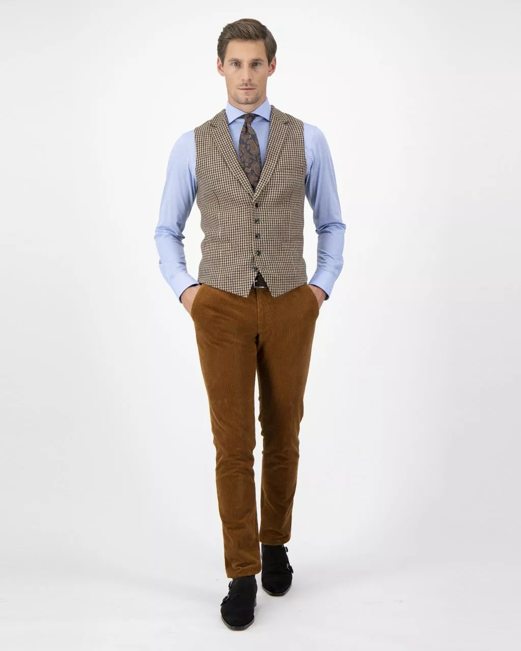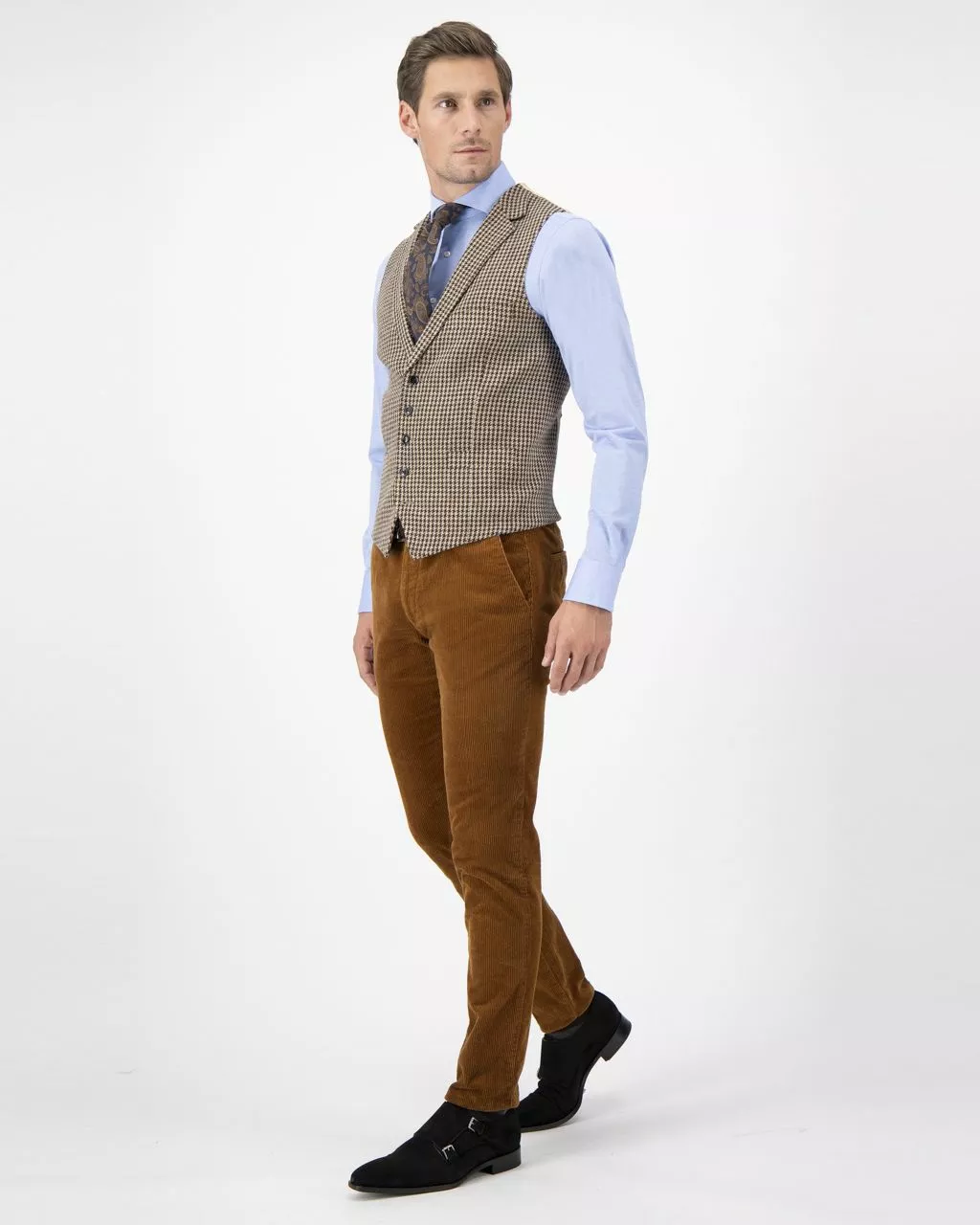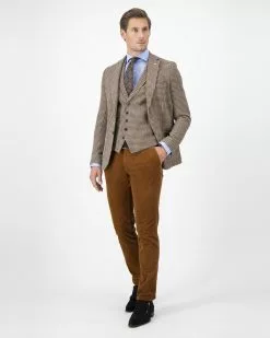 Bruin geruit tweed gilet van Dutch Dandies. Het patroon van deze ruit is een zogenaamde ‘Pie de poule’. De stof voor dit colbert is afkomstig van de Italiaanse stoffenleverancie…