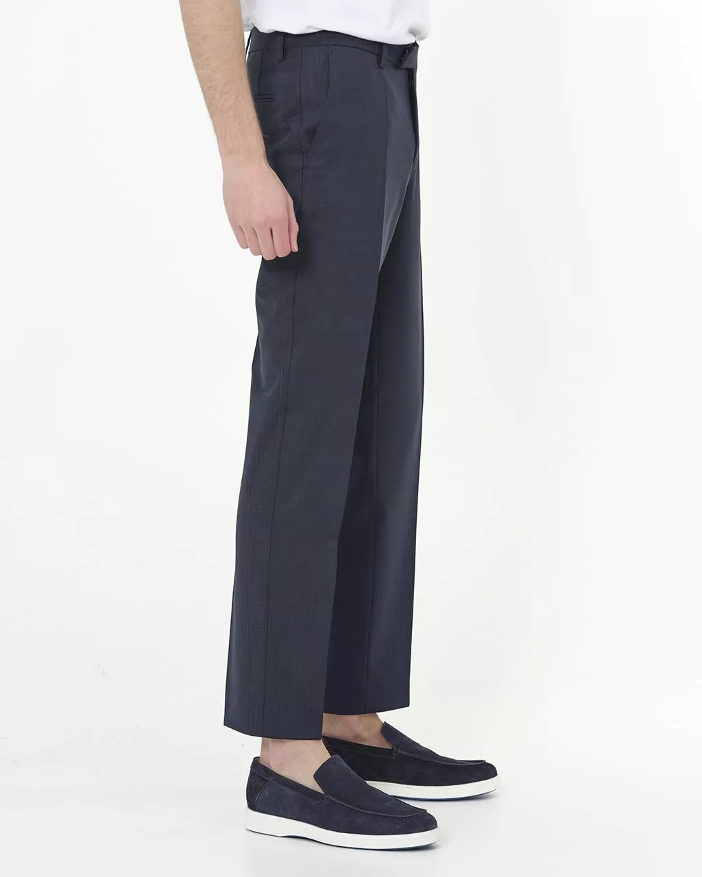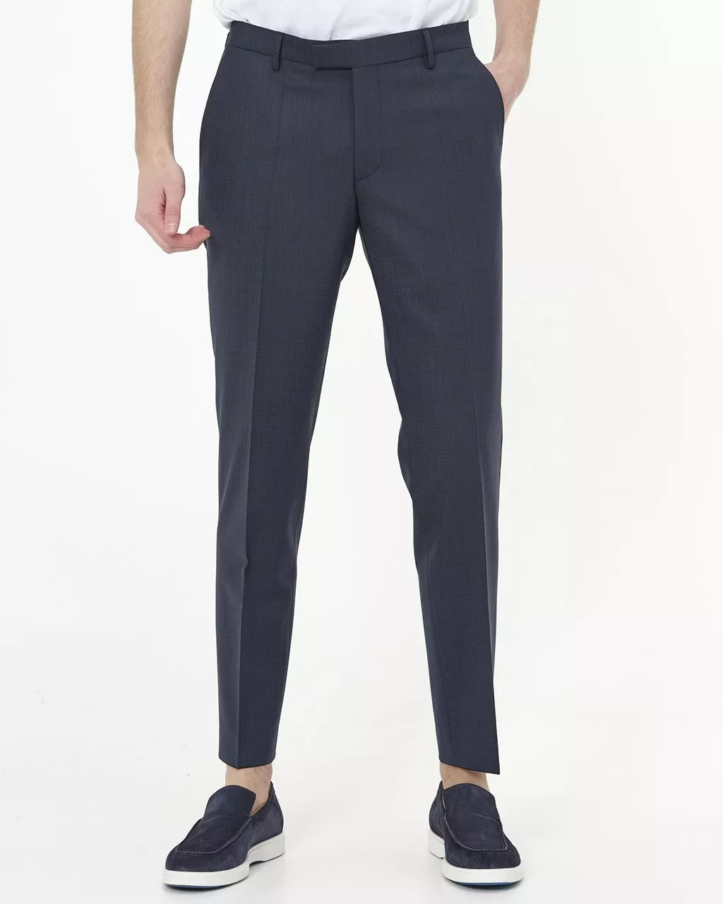 Mix & Match pantalon van Pierre Cardin in donkerblauw met smal ruitpatroon. De pantalon heeft een fijne stofsamenstelling en voelt erg licht aan. De pantalon heeft twee steekzakken…